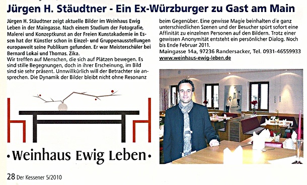 Das Restaurant Ewig Leben im Weingut Schmitts ist bekannt für Kunstausstellungen. Eine Reihe von Künstlern hat bereits in den modern gestalteten Räume des Weinguts ausgestellt. Noch bekannter ist Randersacker für seinen Weißwein, der im Falle des Hausberges ewiges Leben spenden soll. Jürgen Stäudtner zeigt große Teile der Serie über öffentliche Plätze, erweitert durch ohne Titel, der Serie von Around documenta xii über Hintergründe.